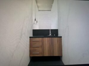 A bright and minimalist bathroom vanity that makes use of light-colored wood and a sleek white countertop. The floating design creates a sense of space and modern elegance. A large, frameless mirror and modern pendant lights complete the look, reflecting the white and gray marble-look walls and contributing to a tranquil atmosphere.